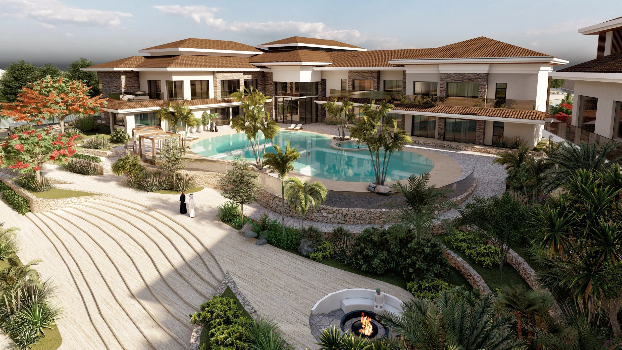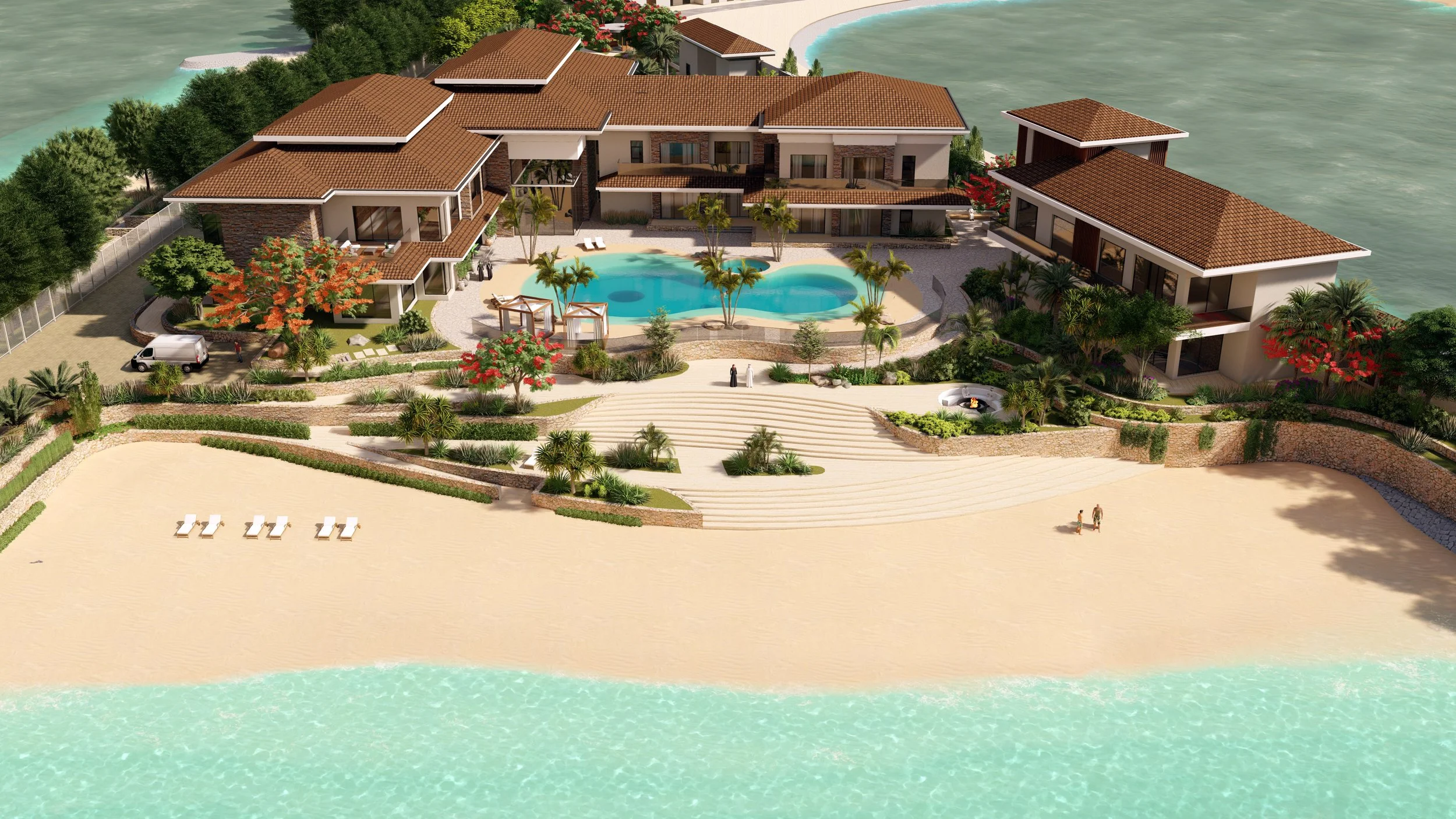 The client of this private villa in Abu Dhabi sought to merge the elegance of Spanish architecture with the openness of contemporary coastal living. The design responds with a composition that celebrates light, connection, and a spirit of gathering. Generous social spaces flow toward a sea-facing pool, while the interiors balance playfulness with refinement through layered textures and curated details. The ground floor is envisioned as a vibrant social hub where indoor and outdoor life blend effortlessly. Surrounded by landscaped gardens, a greenhouse, and a private beach, a service yard and staff accommodation, the villa’s exterior of white rendered walls, stone foundations, and timber accents evokes a timeless resort character that feels both grounded and alive.